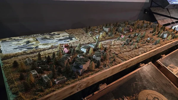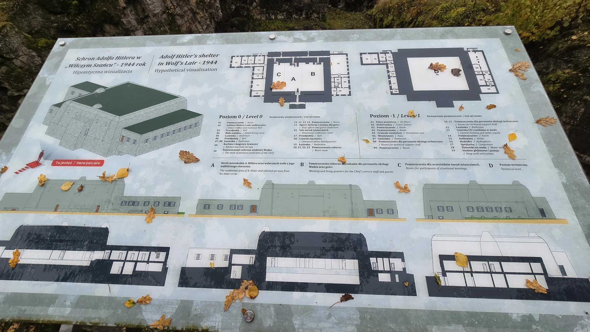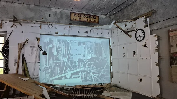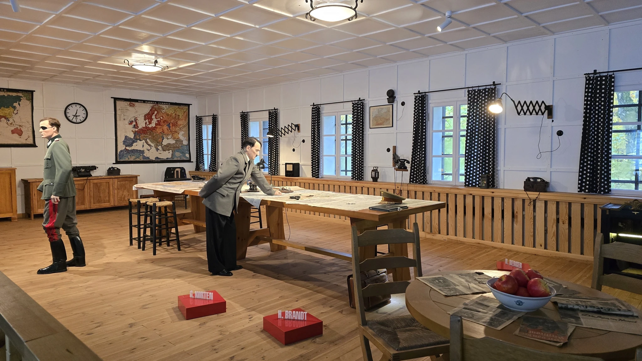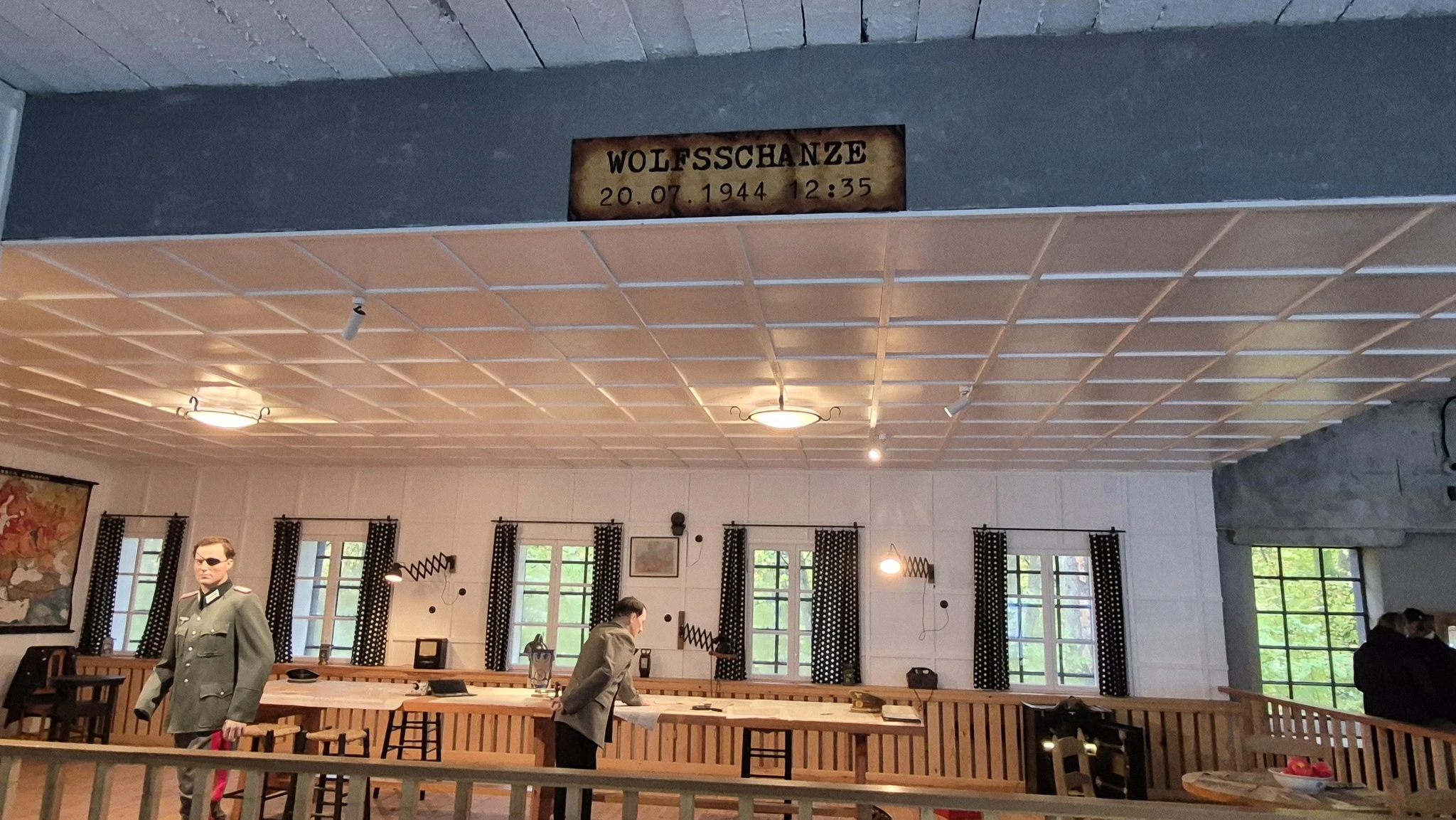 Üks oluline maja, millest praegu alles vaid vundament, oli kunagine koosolekute maja. See on maja, kus toimus ka üks osa tegevusest Valküüri filmis, ja päris elus ka. Selles majas sokutas kolonel Claus von Stauffenberg koosolekute laua alla lõhkekeha eesmärgiga likvideerida Adolf Hitler. Pomm lõhkeski ja tappis ka inimesi, aga mitte Hitlerit. Vähemalt filmis tundus, et Hitler pühkis peale plahvatust prügi kuue pealt maha ja võõrustas juba paari tunni pärast Hundikoopas Mussolinit. Juba selle vundamendi juures oli mul hea meel, et me olime eelmisel õhtul, filmi ära vaadanud ja tegelikult tuli seda sama Stauffenbergi pommi teemat sel päeval veel ja veel meie teele. Näiteks oli ühes hallis lausa terve tuba sisustatud täpselt nii nagu see koosolekute ruumis oli ja detailselt välja toodud, kus keegi seisis ja kus oli portfell pommiga. Seal kõrval on kohe kujundatud ka sama tuba peale plahvatust. Päris huvitav oli uurida, kus keegi seisis ja mõelda, kuidas ikkagi mõned kaugemal seisjad said surma ja vigastada, aga füürer pääses nii kergelt? Muidugi nagu filmis, läksid sel plahvatuse päeval ka päriselus nii mõnedki asjad vussi. Koosolek pidi tegelikult toimuma suures punkris. Teadlased on ka teinud arvutisi ja leidnud, et kui koosolek oleks toimunud punkris ja kui see sama pomm oleks seal plahvatanud, oleks kõik kohal viibijad surma saanud. Aga mäletate, Hitleril oli kombeks asju viimasel hetkel ringi mängida ja nii toimus koosolek sel päeval, hoopis koosolekute majas. Aga Stauffenberg ja tema kaaslased läksid selle katsega siiski ajalukku. Stauffenbergi fotosid ei olnud Hundikoopas ehk nii palju kui Hitleri omi, aga päris palju oli neid siiski.