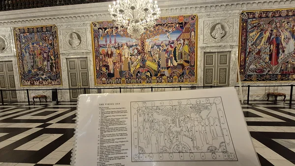 Läksime Liisbetiga rüütlisaali sisse ja vaatasime nii üldjoontes vaibad üle. Siis avastasime me raamatud!!! See oli üks hull raamat või õigemini saime me raamatust aru, kui hullud vaibad need olid. Raamat ütles täpselt, milline on esimene vaip, mida vaadata, milline teine jne. Iga vaiba kohta oli ülidetailne kirjeldus, mida miski sellel vaibal kujutab, miks selline värv või selline sümbol. See oli täiesti tohutu omaette maailm. Kui oleks iga vaiba olemusega detailselt tutvunud, oleks selleks ma pakun, et 4-5 päeva läinud. Meie tutvusime natuke lähemalt ainult esimese vaibaga, mis oligi viikingiajastust – Harald Sinihammas, Ragnar Lothbruk, ohverdused, šamaanid jmt. Ka see tutvus jäi pinnapealseks, sest meil ei olnud lihtsalt aega ega mõnel meist ka kannatust süveneda iga vaibal kujutatud linnu ja samblatuti olemusse. Sellest oli lausa kahju, sest need vaibad oleks nii väärt lähemat uurimist, aga me ju tahtsime ikkagi muid kohti ka avastada. Küll aga ostsime me endale lossipoest 1000-tükilise pusle, mis kujutab just seda esimest seinavaipa. Me oleme suured puslesõbrad ja meil on elutoas puslelaud, kus on koguaeg üks pusle pooleli. Iga pereliige võib selle kallal sobival hetkel nokitseda. Vahel ei pane keegi nädalate kaupa sinna ühtegi tükikest, aga kui vaim jälle peale tuleb, siis ei saa mõnda aega puslelauast eemale.
