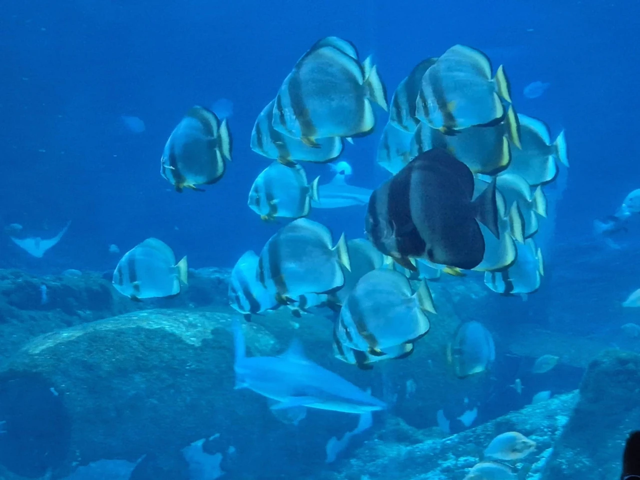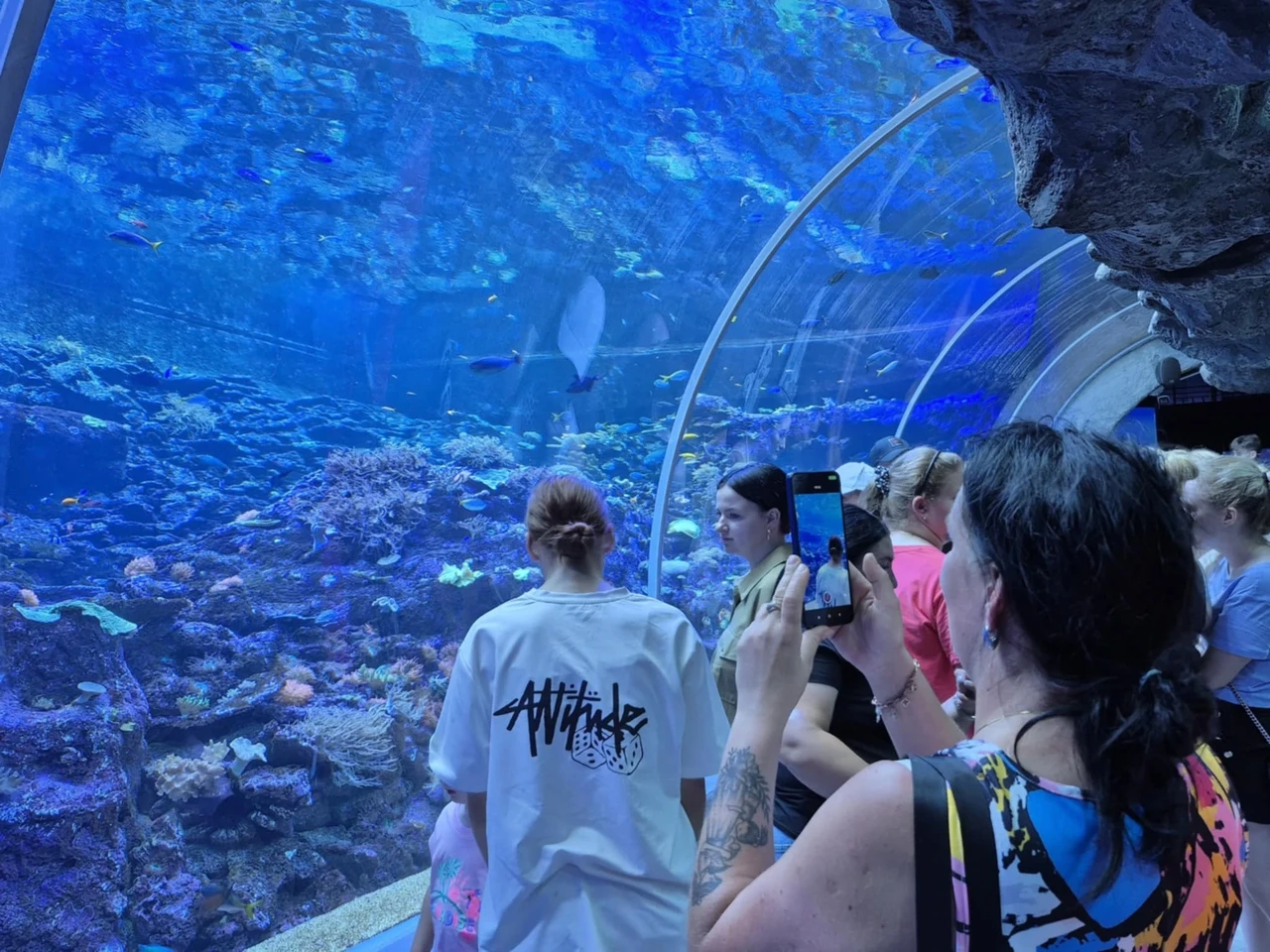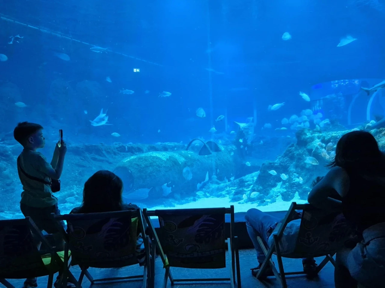 Aga kõige-kõige ägedam oli minu jaoks siiski megasuur ookeaniakvaarium. Seda sai vaadata ühelt poolt ja teiselt poolt ja see kulges toruna üle koridori ning sai ka altpoolt vaadata. Seal olid väiksemad haid ja raid ja muid elukaid ka, kokku umbes 180 liiki erinevaid kalu. Kõige suuremas basseinis on põhjas kuristik, kus lebab Teise Maailmasõja aegse Jaapani hävitaja koopia. Kõige viimasena enne loomaaiast lahkumist me läksimegi selle akvaariumi juurde. Sinna äärde on sätitud rannatoolid ja tumbad ning sinna võibki istuma jääda, muudkui vaatad ja vaatad seda ookeani. Ja milline omaette, aga süsteemne elu seal käib. See meenutas täpselt näiteks Haikala lugu või Käsna-Kallet, kus käib tohutu liiklus, aga ometi süsteemne, valgusfoorid, liiklusmärgid jne. Akvaariumis tegelikult muidugi polnud valgusfoore, aga liiklus käis nii nagu oleks olnud. Istusime seal ja vaatasime ja kuidagi ei tahtnud ennast püsti rebida ja ära minna. Aga no ühel hetkel siiski upitasime ennast üles, läksime taas välja päikese ja kuuma kätte ning süda oli selle loomaias käiguga ikka väga rahul. Kui Łódźis olete, siis külastage kindlasti!