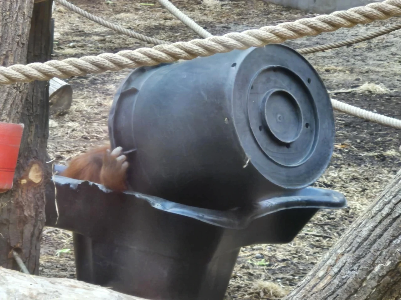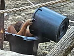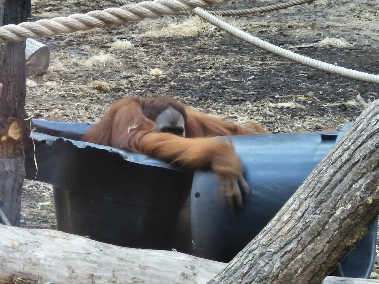 Aga igatahes kui me siis ühel hetkel, kui meil ülejäänud loomaaed üle vaadatud oli, tagasi Orientaariumisse läksime, kostis sealt valju tagumist. Mina mõtlesin, et äkki ehitatakse midagi, aga Meelis ja Liisbet olid kindlad, et mingi loom kolgib. Kui lähemale jõudsime, veendusime, et see tõesti oligi loom – üksik orangutan oma suurel ja ägedal alal, tagus vastu raudluuki, kust sai kas välja või mõnele varjatud alale. Lugesin veebist, et neid orangutane on seal tegelikult ikkagi mitu ja võibolla ta tahtiski teiste juurde minna. Igatahes ta tagus ja tagus, aga siis tundus, et tal hakkas oma käitumise pärast piinlik või oli see midagi muud, aga ta hakkas ennast peitma ja naljakaid tempe tegema. Kõigepealt ronis ühe toru sisse ja rullis ennast sellega ringi. Siis pani ta endale ämbri pähe. Siis ronis ta vanni ja pani endale ämbri pähe ja teda nagu polekski seal puuris olnud. Siis mõne aja pärast ilmus vanni äärele väike karvane käsi ja siis jalg ning see kõik nägi välja nagu meeleheitel kunstniku pange-mind-tähele hüüe. Seda oli äge vaadata ja see oli nunnu ja naljakas üheskoos. Łódźis elavad Poola ainsad Sumatra orangutangid.