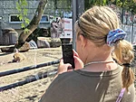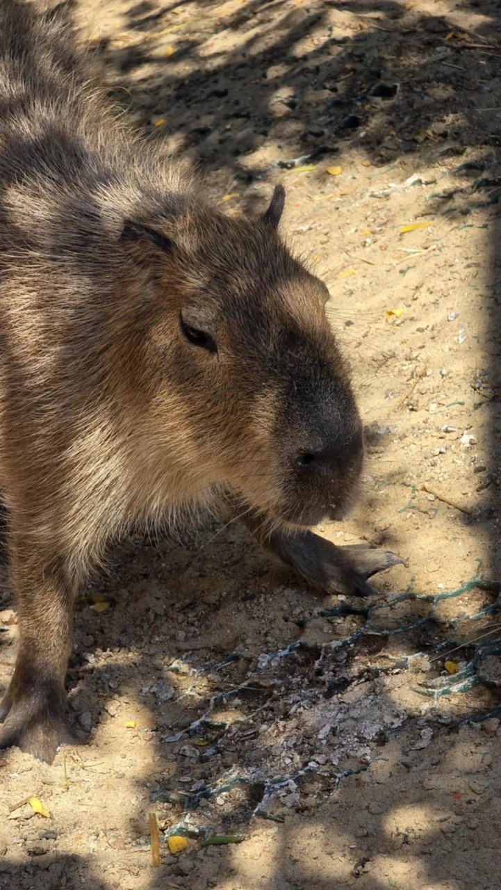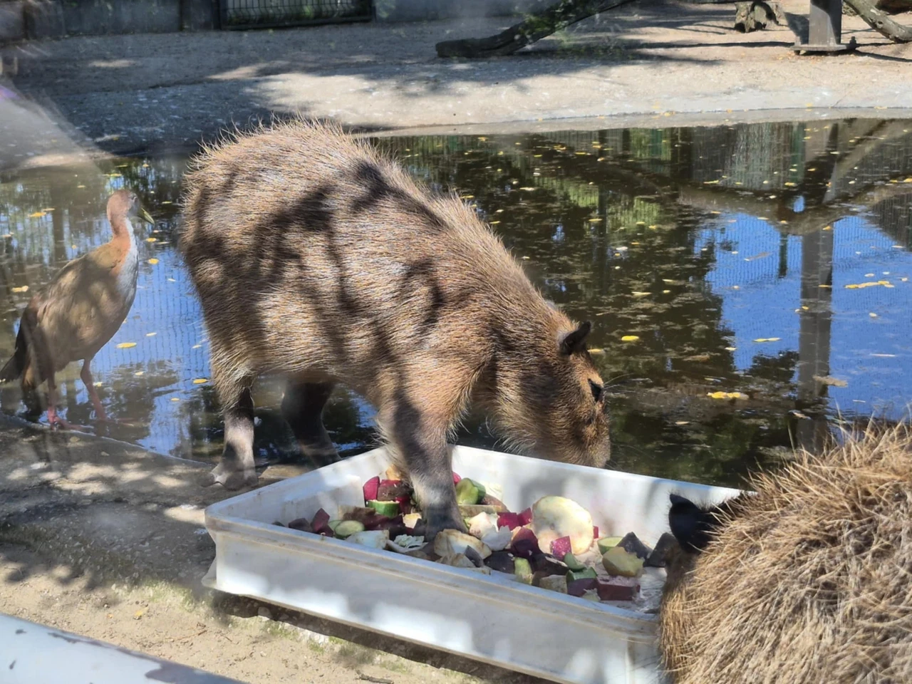 Me käisime kapipaarade juurest juba enne läbi ja vaatasime neid täitsa pikalt, aga selleks ajaks kui neil söögiaeg oli, sättisime me ennast jälle kapipaarade juurde. Õigemini sättisime me ennast kõigi nende inimeste taha, kes ennast juba kapipaarade juurde olid sättinud. Kapibaaradele toodigi süüa, aga esialgu ei näinud me muud, kui et peoga visati kartuleid laiali ja suur kast oli mingit kraami täis. Ma lootsin, et kapibaarad mäluvad korralikult ja söövad aeglaselt, et osadel inimestel juba isu täis saaks vaatamisest ja Liisbet siiski ka näeks, kuidas kapibaarad söövad ja mida söövad. Õnneks oligi kapipaarade lõuna palju pikem kui inimeste meel ja ühel hetkel hakkasime ka meie nägema ja lõpuks vaatasime veel üsna üksi seda söömaaega.