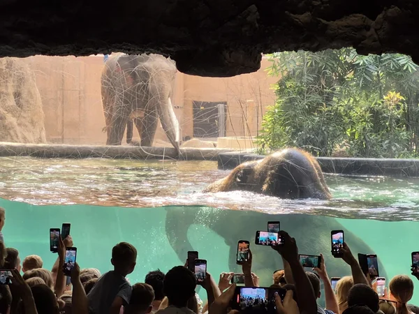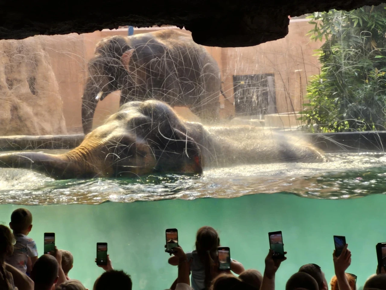 Me ei jõudnud loomaaia juurde päris avamisajaks, aga no peaaegu. Rahvast oli piletikassade juures nii palju, et ma peaaegu ei suutnud oma silmi uskuda. Enamik tundusid olevat perepäeval – ema, isa, lapsed või vanaema, vanaisa ja lapsed või need eelnevad komplektid koos. Ja ilm oli vaatamata hommikusele ajale juba tulikuum, nagu me muidugi eeldanud olimegi. Läbisime piletiraja ja siis võtsimegi kohe suuna Orientaariumile. Üks populaarsemaid või siis, et kõige populaarsem ja enim reklaamitud atraktsioon on seal samas Orientaariumis kaks korda päevas aset leidev elevandivann. Meil oli suurepärane plaan, et läheme kõigepealt Orientaariumisse, vaatame ära, kus seal see koht on, kus elevante vannitatakse. Siis on meil veel külalt aega, et mujal ringi vaadata ja õigeks ajaks supsti elevantide juures tagasi olla. Läksime koos pideva inimvooga koos Orientaariumisse ja leidsime üsna kohe vannikoha üles. Meil oli plaan vaadata vanni suunast, mis selleks ilmselt kõige popim on. Seal näeb nii vee alla kui vee peale. Tegu oli ühe suure punase savikarva ruumiga, kus oli seina sees klaaspaneel läbi mille nägigi elevandi aedikusse, kus oli bassein. Mingil põhjusel, ja me arvame, et põhjuseks on huligaanid, oli klaas vee kohal häirivalt kraabitud. Klaasakna ees oli vaba ruum kõndimiseks ja siis olid kivist tõusvad astmed istumiseks. Astmete ülevalt läks rõdu moodi eraldi käigurada puhuks, kui sa ei taha alla ronida ja sealt akna eest läbi minna.