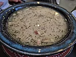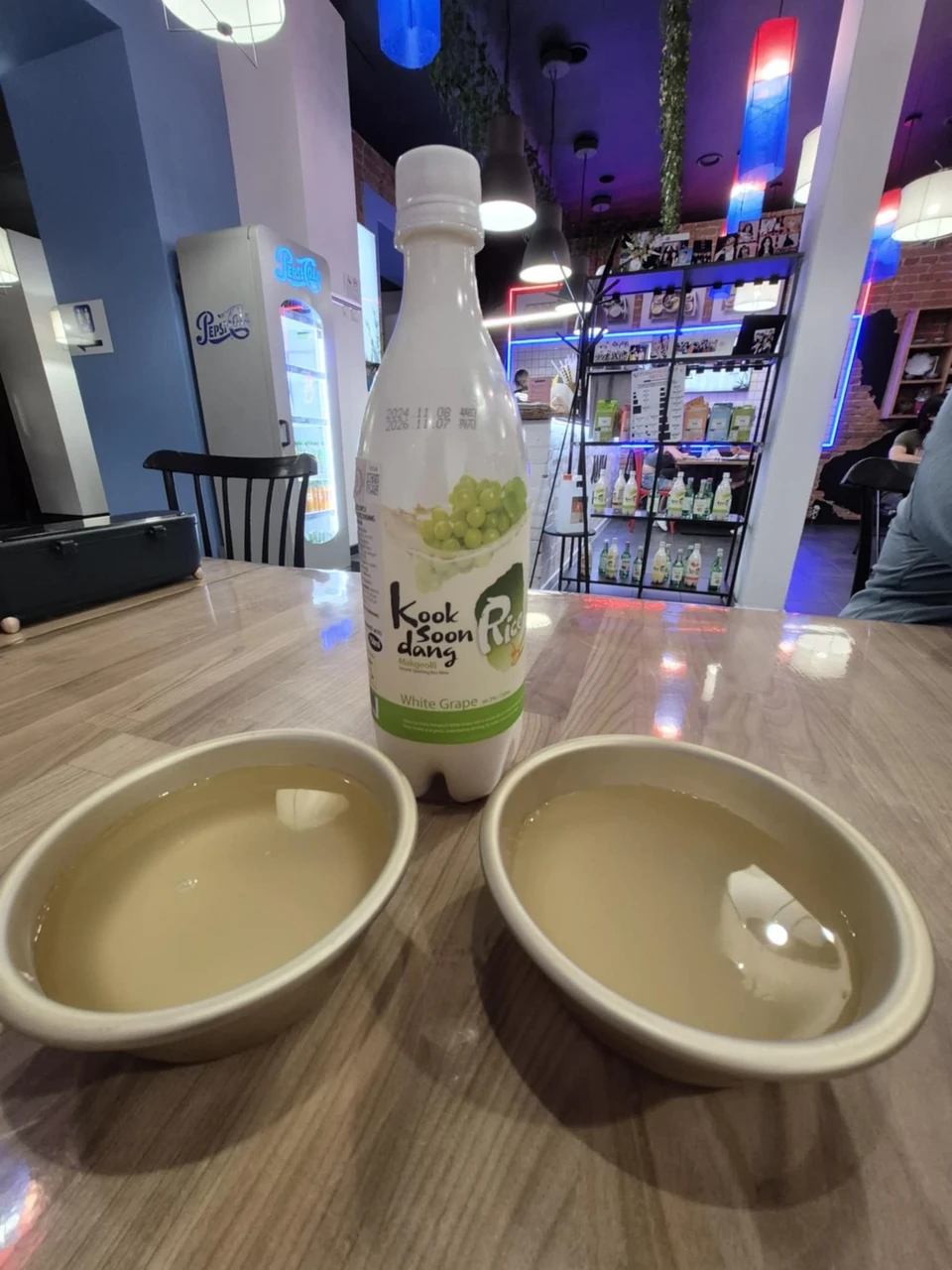 Vaatasime siis menüüst mõned erinevad road välja ja tellisime ära. Meile Meelisega hakkas silma ka riisivein ja mõtlesime, et proovime ära. Riisiviina oli ka muidu, aga seda me ei soovinud. Riisiveini oli viinamarja-, banaani-, maasika- ja kastanimaitselist. Võtsime viinamarja oma, et see kuidagigi traditsioonilist veini meenutaks. Müüja pani valge plastpudeliga veini letile ja mingil hetkel tellimise vältel ilmusid letile ka kaks väikest plekist kausikest. Võtsime pudeli ja kausid ja läksime oma lauda. Esimene mõte oli, et ju siis nendest kaussidest juuakse veini. Teine mõte oli muidugi, et äkki ei jooda ja me jääme lolliks ja naerualusteks. Meil on varem ka juhtunud, et me ei saa aru, et kätepuhastusrätt, mis on kenasti ja osavalt rulli keeratud on kätepuhastusrätt ja me pole vahel ka näpuloputuskaussi ära tundnud. No igal juhul küsisime teenindajalt üle, et kas need kausid on veini jaoks. Keegi teine ei paistnud veini joovat ja seega ei saanud kellegi pealt spikerdada ka. Aga valasime siis veini kaussidesse, lõime salaja kokku ka ja mekkisime. Mmmm, see oli hea ja magus, mitte liiga tugeva maitsega ja ka promille oli tal 3-4 vist. Täitsa huvitav maitseelamus oli. Tõtt öelda jõime me selle ära ja siis proovisime veel banaanimaitselist ka. See oli ka hea, aga kui seda niisama maitsma juhtuks ei oskaks aimata küll, et tegu on veiniga.