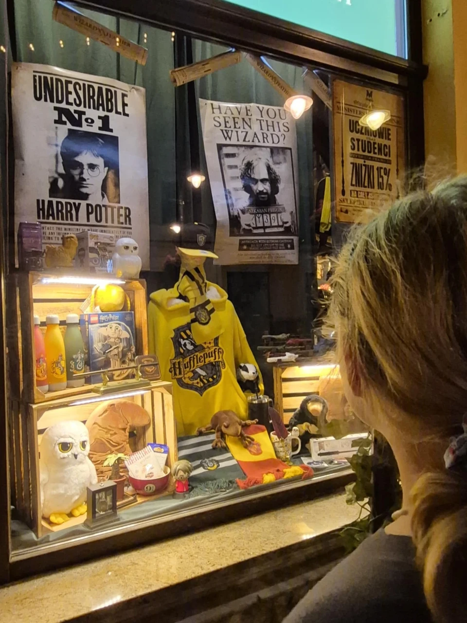 Kuna meie olime Piotrkowskal pühade ajal, siis jäi võimalik poekülastuse vahemik hästi lühikeseks ja me poodides põhimõtteliselt seal ei kolanud. Käisime ainult Zabkas ja Harry Potteri võlupoes. Viimane oli muide üks vaatamisväärsus omaette ja me olime seal tillukeses poes kokku lausa tund aega. Seal oli ikka igasugu põnevat kraami ja juba kogu kujundus oli nii lahe ja avastamist väärt. Pood oli tegelikult veidi ka kohvik ja sealt sai erinevaid kohvijooke tellida. Meil oligi plaan esialgu poodi vaatama ja kohvi jooma minna, aga lõpuks me vaatasime seal nii kaua, et kohvi enam jooma ei hakanud. Kõige keerulisem oli muidugi see, et lubasime Liisbetil endale poest ühe asja valida, ja no seda ta ikka valis pikalt ja põhjalikult. Me pidime ikkagi natuke valikut mõjutama ka ning õnneks ei lahkunud me võlupoest mehhaanilise sõõlamiskübara või sädemeid pilduva võlukepiga. Noh, natuke on kahju ka muidugi.