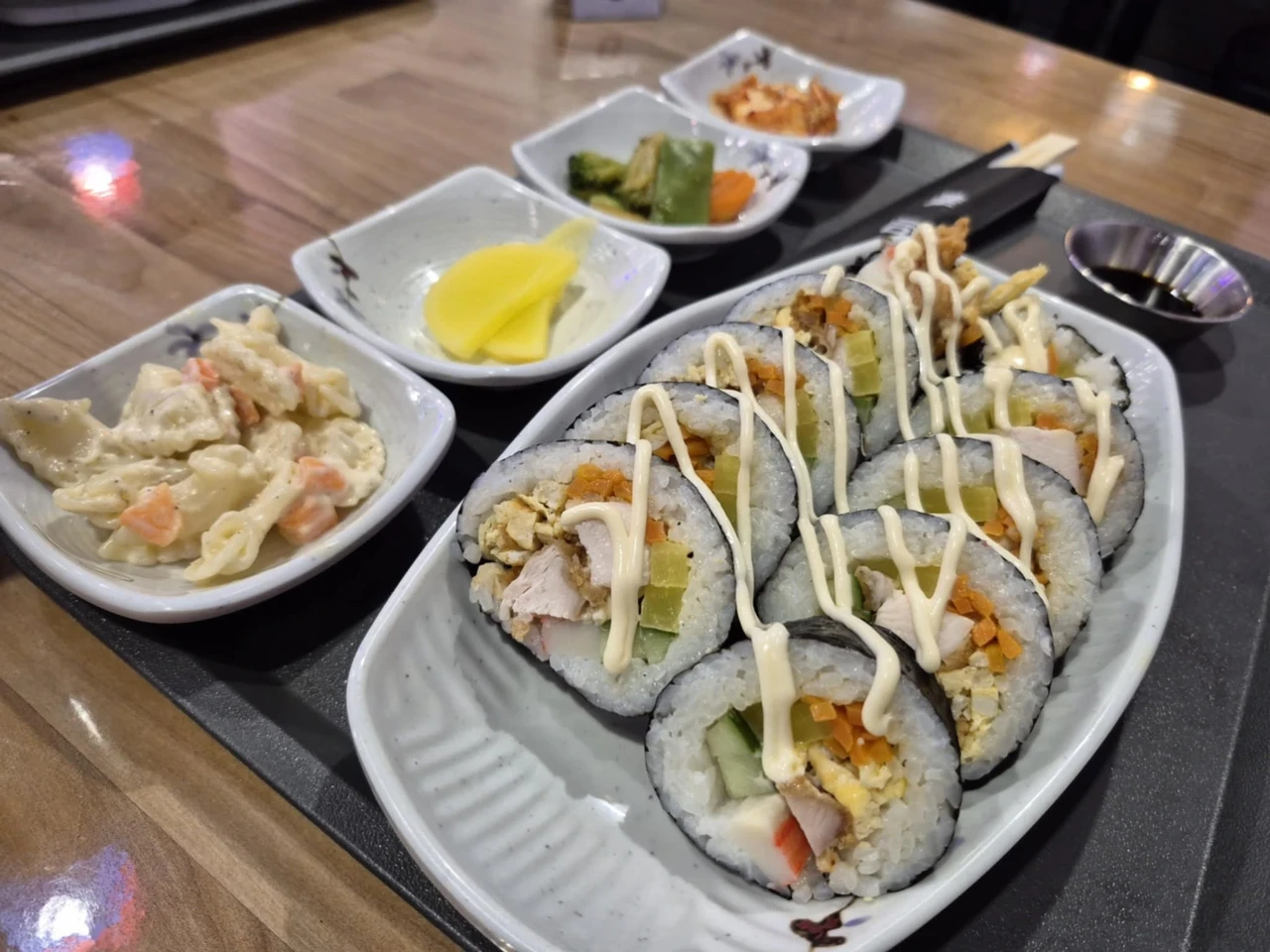 Meelis võttis mingit sealiha ja see maitses ka hästi. Liisbet tahtis kimchi riisi võtta, aga see oli ainuke asi kogu menüüst, mida tegelikult ikkagi sel õhtul ei saanud. Kuna mina olin tellimas, siis ma valisin talle ise ruttu midagi, mis nägi välja nagu sushi. Ja see nägi lauale tooduna ka välja nagu sushi, aga no see ei maitsnud nagu sushi. Ma mõtlesin, et mis maitse teistsuguseks tegi, ja ma arvan, et see oli riis. Sushi riis on kleepuv ja hapukas, aga see ei kleepunud ja oli neutraalse maitsega. Sushilaadne toode oli hea, aga mitte nii hea, et teinekord ei tahaks midagi muud proovida.