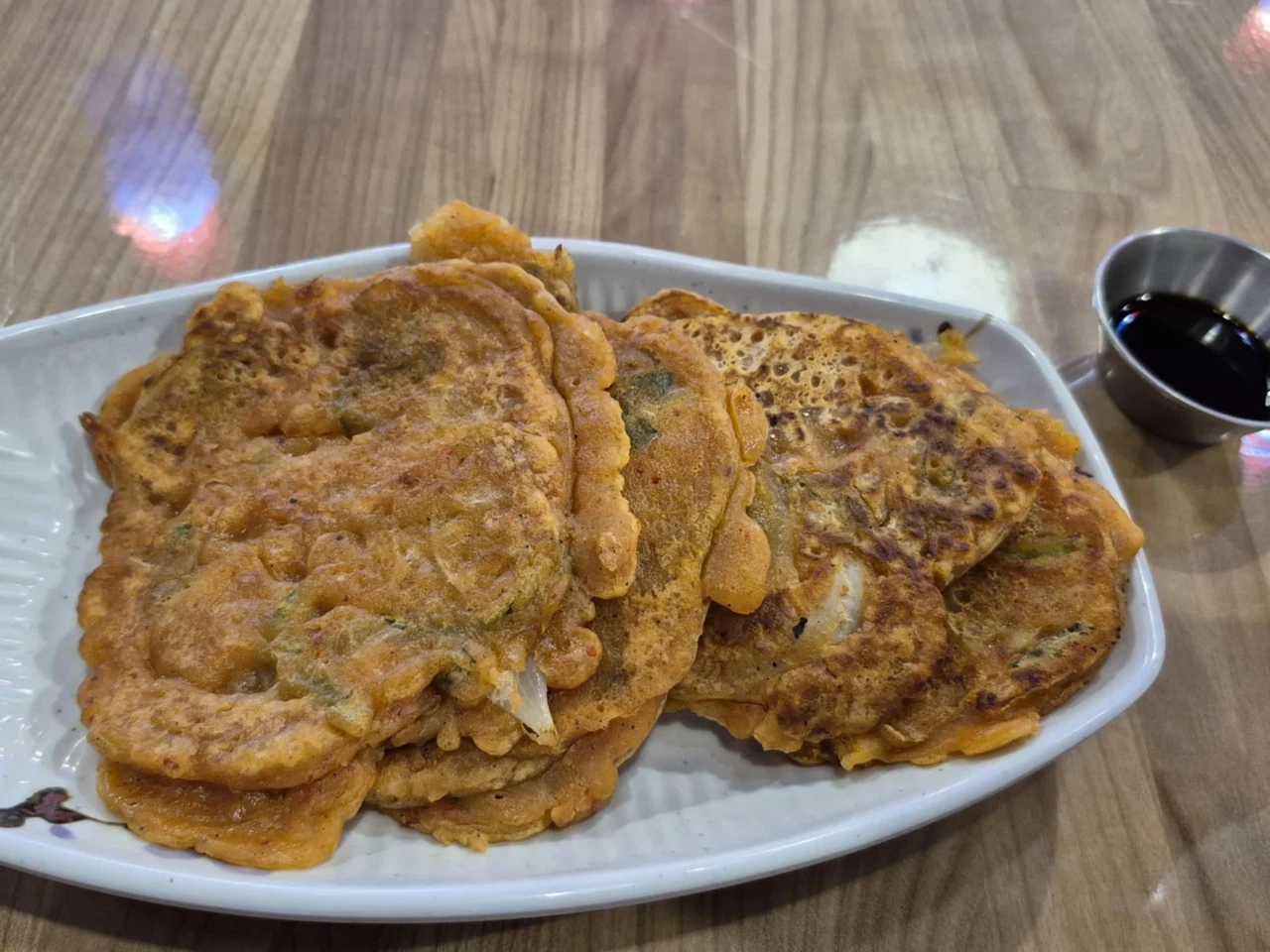 Siis võtsime me veel kimchi kotletid, mis maitsesid nagu ühed täitsa head juurviljakotletid. Iga roaga, isegi supiga, olid kaasas ka väikesed kausikesed, kus olid erinevad lisandid. Seda ma olen enne ka kuulnud-näinud, et Koreas niimoodi käibki, et tellid ühe asja, aga veel hulk väikeseid kausikesi tuleb ka kaasa. Ühes kausis oli kimchi, ühes keedetud brokoli, ühes oli midagi, mis tundus meile makaroni salatina ja ühes kausis oli tundmatu kollane objekt. Väga põnev kogemus igatahes.