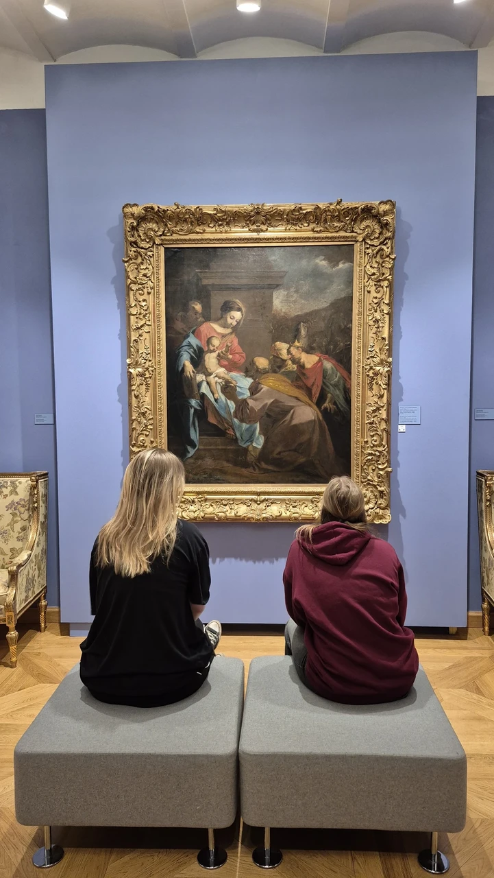Meie võtsime lossi kombopileti, et vaatame siis ikka kõik ära - nii lossis asuvad näitused, torni kui ka selle pärlite pärli – freskodega kaetud kabeli. Lossis oli väga mitu erinevat näitust. Üks oli inimkonna vanema ajaloo näitus alates kiviajast. Saime jälle üle vaadata, kuidas kõik alguse sai ja arenes. Teine suur osa oli maalikunstinäitus ja sinna sekka oli paigutatud ka vana mööblit. Seal oli tegelikult Poola tasemel väga kuulsat kunsti ka, aga no me pole üldse kunstiteadlikud ja vaatasime lihtsalt kenasti kõik üle. Seda maali vaatasime ka, mis oli nimetatud kollektsiooni pärliks.
