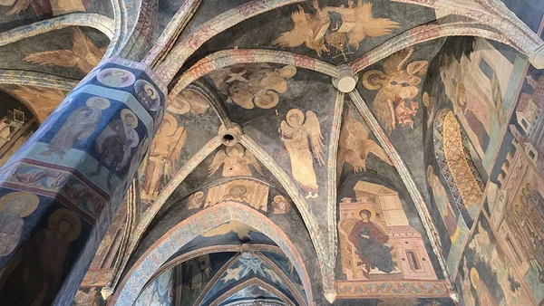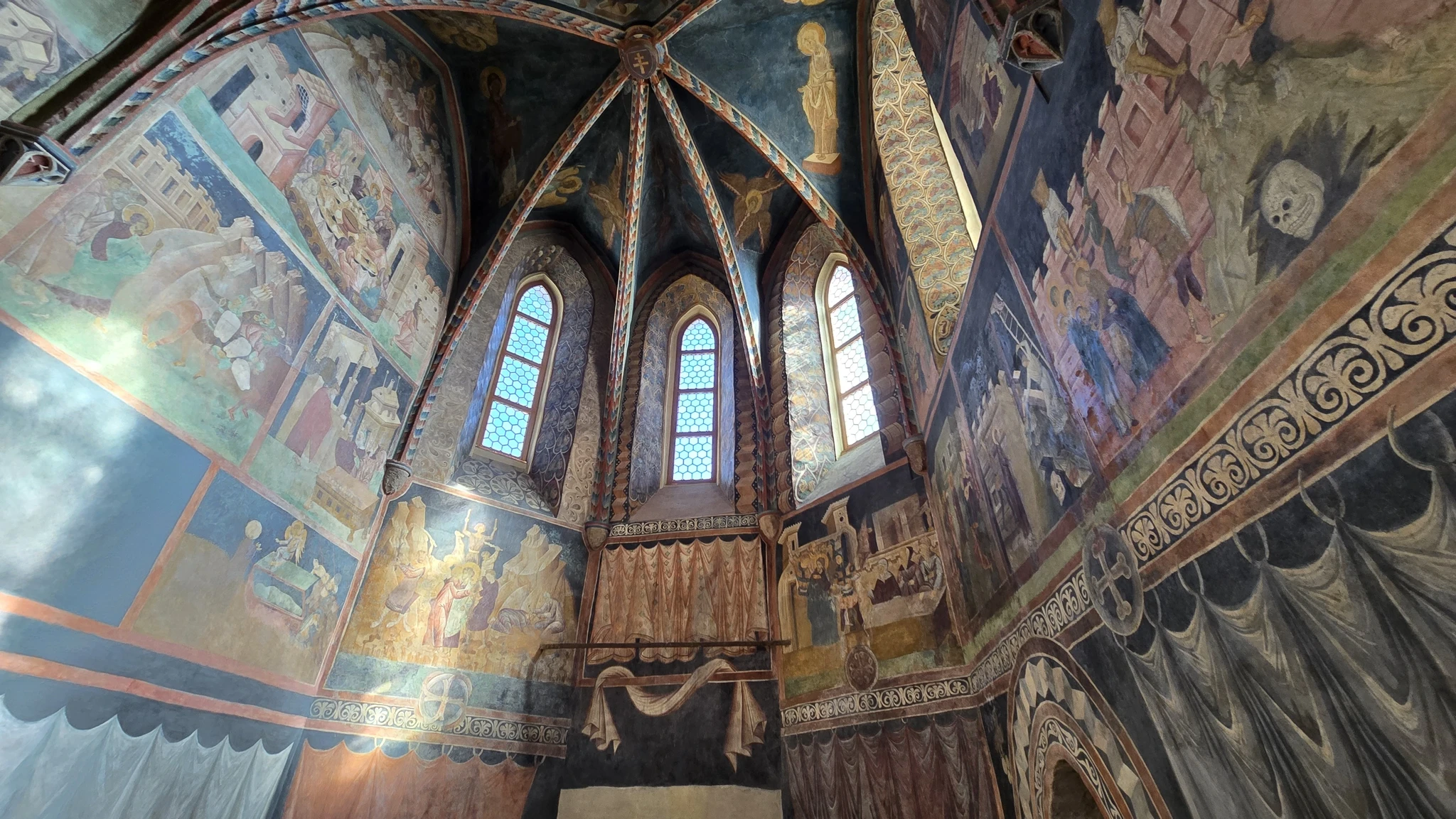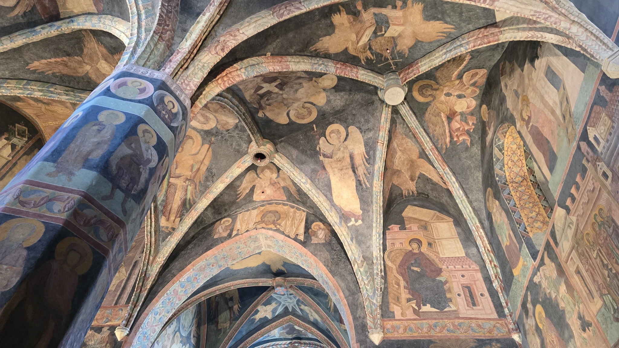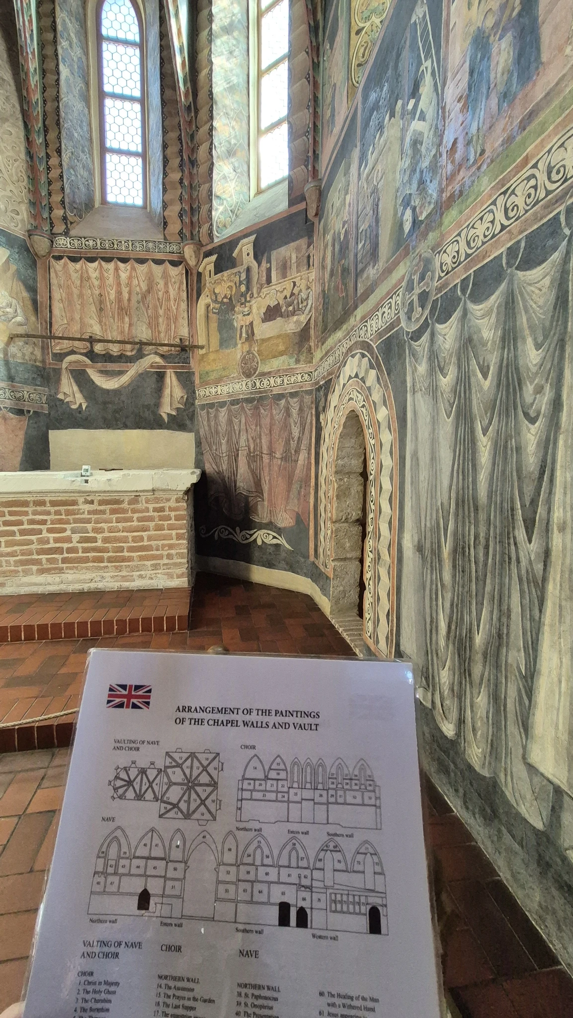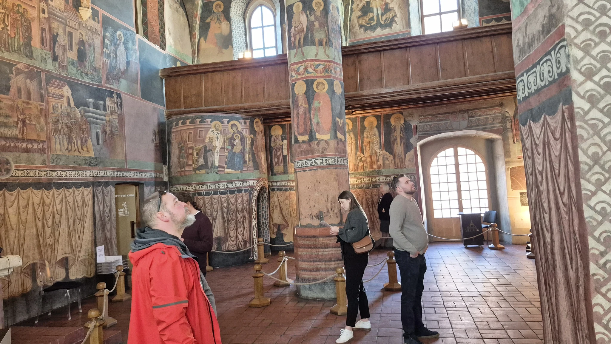 Ja muidugi see kabel – kuulus Püha Kolmainsuse kabel. Kabel ei ole praegu aktiivselt kabelina kasutuses. Ma sain aru, et seal toimub vahel mõningaid erilisi üritusi, aga muidu on see ikkagi muuseumi osa ja no pigem isegi kunstisaal. Läksime aga julgelt ja lustlikult kabeli suunas. Siseneda tuli klaasuksest ja kui meie lustlikult läbi selle klaasukse sisenesime, siis ups, teisel pool oli kurdistav vaikus ja kõik inimesed seisid ning uurisid kabeli seinu ja lage mingi A4 paber käes. Me oleks nagu valesse kohta sattunud. Ei suutnud seisukohta võtta, kas siin käib parajasti mingi tund või midagi muud väga olulist ja kas peaks lahkuma. Aga no meil oli pilet ja me tahtsime ka korraks pilgu heita ikkagi, seega otsustasin, et isegi, kui me ei peaks hetkel seal olema ja me matsid oleme, siis me piilume ikka. Seisime siis ka keset põrandat ja vaatasime uudistavalt ringi. Kabel ei ole väga suur, aga kõik selle seinad, kogu lagi ja ka kõik tugisambad ja no kõik-kõik, oli kaetud maalingutega. Ma sain aru, et tegu on näiteks erinevate seikade ja tegelastega piiblist. Mõne aja pärast märkasin ma, et ukse kõrval on väike riiul ja seal need A4 asjad olidki, mida enamus käes hoidis. Astusin lähemale ja võtsin meile ka inglise keelsed A4-d. See oli juhis piltide mõistmiseks. Seal oli märgitud ilmakaar ja mitmes pilt nt põhjaseinal ja siis oli selle pildi pealkiri nt „Kolm tarka“. Kuna kõik seinad olid täis väiksemateks ristkülikuteks või vahel ka kolmnurkadeks jagatud pilte ja neid oli palju, siis minul vähemalt oli päris raske tuvastada, mis on mis. Esimene raskus oli juba see, et kuidas tuvastada ilmakaared, et milline siis on põhjasein näiteks. Praegu tagantjärgi ma mõtlen küll, et lollpea, seal oli ju sümboolne altar olemas ja ma tean küll, millises ilmakaares altar on, aga vot seal ma sellele ei mõelnud. Meelis jagas seda pinnalaotust palju paremini, luges aknaid ja uksi ning osutas mulle, et see on see sein ja too on too. Igal juhul me uurisime üksjagu seinu, aga nii huvilised me polnud, et üks haaval kõik pildid tuvastada ja neid uurida. Aga ma mõistan, miks see kabel vaata, et linna suurim ja olulisim vaatamisväärsus on. See on tõesti midagi erilist, mida mujal ei ole.