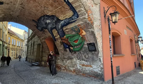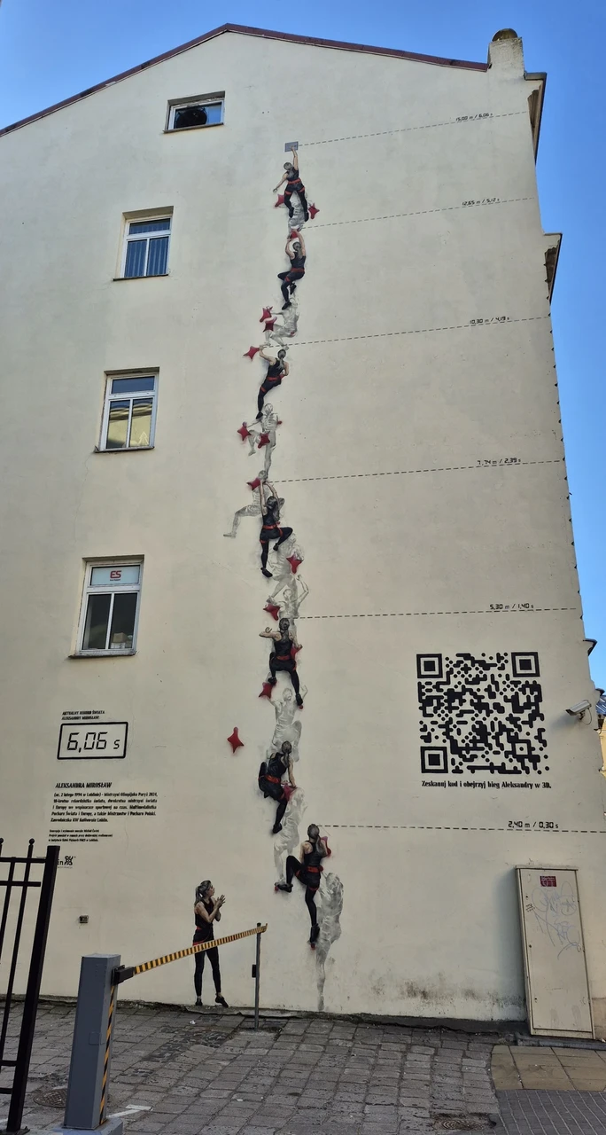 Üks seinamaal, mis ei asu vanalinnas, jäi meile ette täiesti juhuslikult hommikusel koerajalutusretkel. Aga ma tundsin selle kohe ära! Ma olin seda kunagi meedias näinud. See maal on kortermaja seinal ja kujutab Aleksandra Mirosławi ronimas. See on täpselt üks ühele mõõtmetes ja maali nurgas on ka Aleksandra Mirosławi nimel olev maailmarekord, mida Aleksandra ise koos kunstnikuga on juba korra üle maalinud. Aleksandra Mirosław on Lublinist pärit ja ka praegu seal elav ämblikaine. Minu jaoks sai ta kangelaseks Pariisi olümpial, kus mina, ja muidugi kogu ülejäänud maailm ka, nägin teda täiesti uskumatul kiirusel mööda seina üles jooksmas. Tema ala ongi seinaronimine või veel täpsem nimi on vist kiirronimine. Pariisis ta uuendas lausa kaks korda maailmarekordit. Mulle meeldib eriti, et see seinamaal on pärismõõtmetes ehk Aleksandra on täpselt nii suur nagu ta on ja sa ise saad ka seal seina juures seista ja üles vaadata ning mõelda, kas sa üldse oleks nõus sinna ronima ja kui kaua see sul aega võiks võtta.