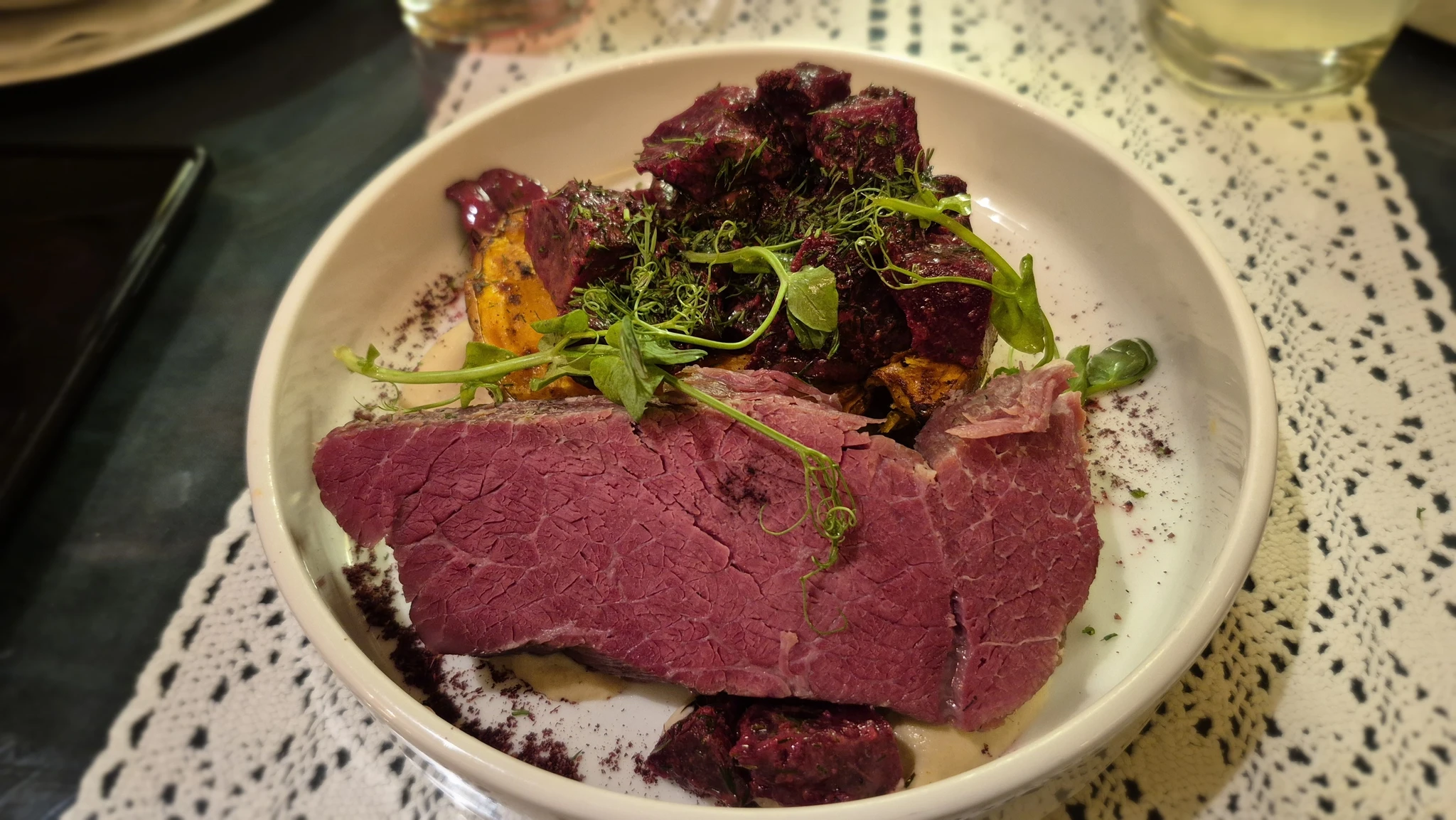 Me siis läksimegi kuue paiku õhtul ja esimene asi, mida meilt uksel küsiti, oli, kas teil reserveering on. Ehhh, muidugi ei olnud. Aga nad leidsid meile koha. Nii ettekandjad kui ka kogu interjöör oli väga autentne või no vähemasti selline, kuidas mina juudiolustikku ette kujutan. See oligi üks asi, mis mulle seal kõige kõige rohkem meeldis – detailideni läbimõeldud autentsus. Mängis muusika, mida mina nimetaksingi juudimuusikaks ehkki mul puudub igasugune aimdus, kas on olemas eraldi juudimuusika. Seal ei pakutud pitsat ja pastat ning seal ei saanud menüüst isegi sabatitoite tellida, mis seal muidu kirjas olid, sest sel päeval ei olnud parajasti sabat (reedesest päikeseloojangust laupäevase päikeseloojanguni). Tükkaega uurisime ja no ettekandja soovitas ka kohe igasuguseid roogasid peale seda, kui ta küsis, kas me oleme nende juures esimest korda.