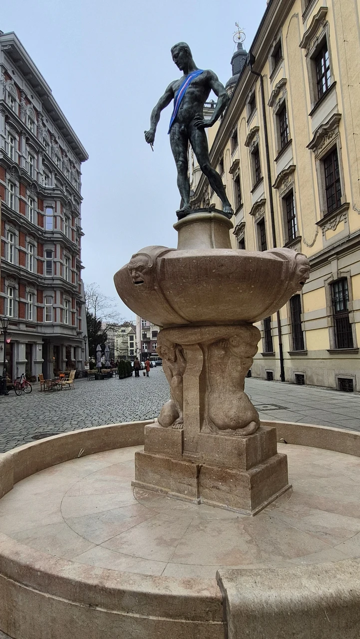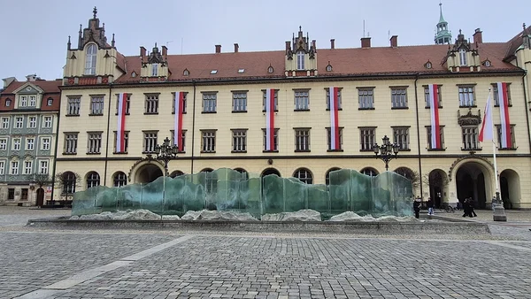 Väljakul on ka mitu olulist monumenti ja mulle eriti sümpatiseerinud purskkaev, kus praegu vett ei olnud. Veidral kombel on netist selle purskkaevu kohta väga vähe infot leida. Kirjas on vaid see, et purskkaev avati aastal 1966 ja kirjeldus, milline see välja näeb. Hmmmm, seda ma näen ju ise ka, milline see välja näeb. Veel on kirjas, et kohe hakkasid vaidlused, kas see klaasist ja üsna modernne kunst ikka sobib vanale raekojaplatsile. Mina ka ei tea, kas sobib. Kui mõelda, siis pigem ei sobi vist, aga samas seal ta on ja naudime siis. Mulle muidugi meeldivad asjade juures alati lood. Kui ma lugu ei teaks, siis ma vaataks seda purskkaevu, eriti hooajal, kus vett ei olegi, ka pilguga, et mis asi see veel on ja miks ta siin on. Purskkaev on klaasist ja graniidist ning just klaasist osa on pilkupüüdev – asümmeetrilised klaasist lehed üksteise kõrval justkui mitte midagi kujutavalt. Ei ole seal ei vett sülgavat kala ega lohet. Aga Damian ütles, et see on Wrocławile lähimate mägede ehk Karkonosze profiil. Ahhaaa, seda teades, vaatasin purskkaevu uuesti ja no loomulikult on need mäed, väga ägedad mäed. Ja miks seda infot ometi netist kätte ei saa? Miks seda seal kohapeal kirjas ei ole? See teadmine teeb selle purskkaevu kohe hoopis erilisemaks. Tahaks väga neid mägesid ka suvises veemöllus näha.